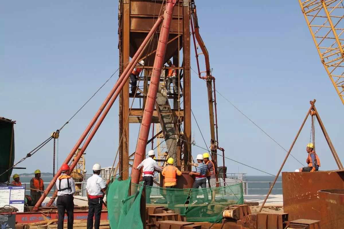 终于一切就绪了,往钢护筒中灌注混凝土。62.3米深的桩,一次性要浇筑近1200方的混凝土。保证混凝土的质量浑然一体,是混凝土施工技术的挑战,而这样的成品桩,每一根都是要经技术检测的。而平潭海峡上打的每一根桩都是优良桩,根根都可称的上定海神针。