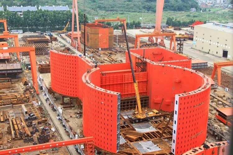 大桥人检查神兵。镇海乾坤锁有多大,长96.8米,宽36.8米,高度16.6米,单套重量3937吨,建成后可抵抗风浪海流力是内河同等规模的20多倍。