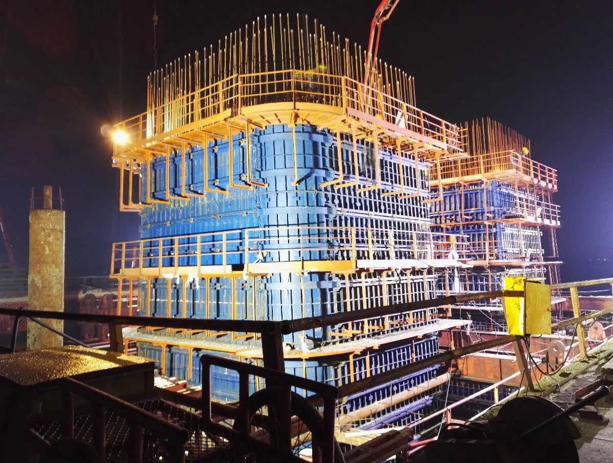 海上正在下放4.5米超大直径钢筋笼,这是定海神针的筋骨。