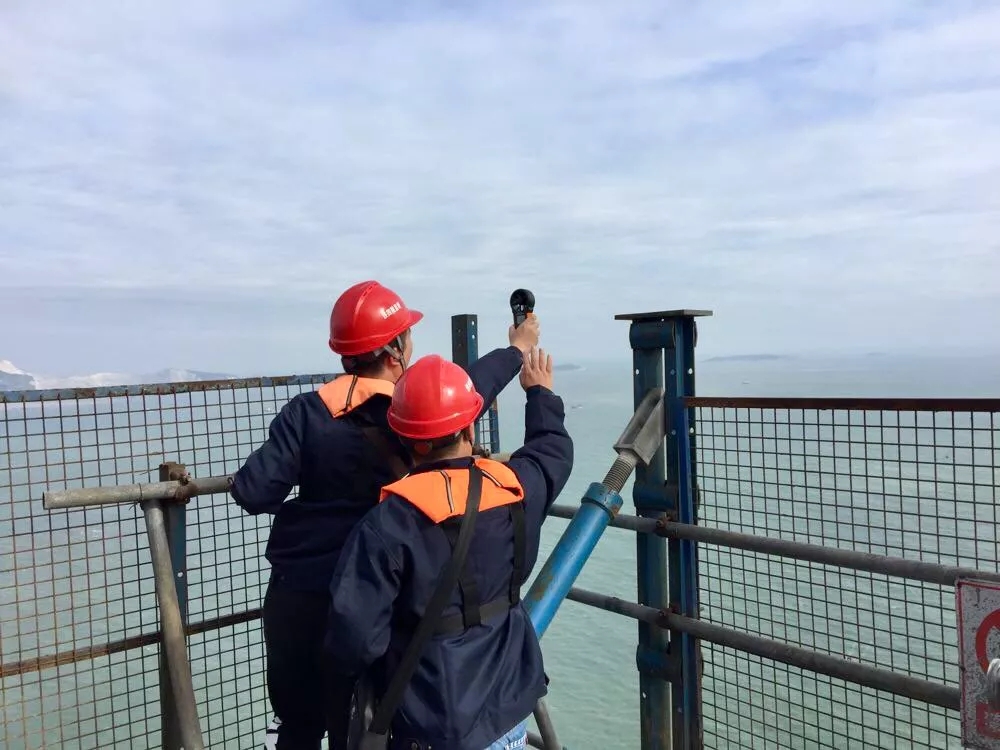 站在塔柱顶端测风的铁四院监理,按他们的说法,平潭海峡的风是一直吹,一直吹,特别是高处,大海的风声就从未断过。所以测风是经常的事情,因为要寻找风小的间隙,要让安全和质量在风的间隙中安然通过。