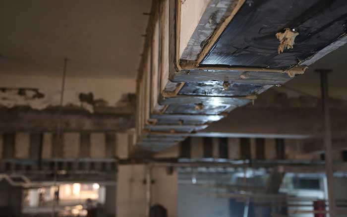 在楼板受拉区粘钢加固、贴碳纤维片材加固, 这两种方法适用于提高正截面受弯承载力;当洞口边有集中荷载, 以及洞宽或直径>1000mm时, 洞口边应设梁。楼( 屋面) 板裂缝修补: 裂缝有已稳定、未稳定两种稳定状况, 应根据裂缝成因、裂缝宽度、裂缝深度、稳定状况、钢筋是否锈蚀、修补目的等, 选用不同的加固方法。裂缝加固方法有:表面处理法、灌浆法、填充法、表面涂渗透性防水剂。裂缝修补的目的增强防水性能、增强承载力、增强耐久性。