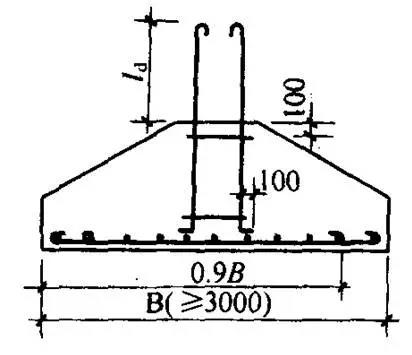 (1)单独基础系双向受力,其受力钢筋直径不宜小于8mm,间距为100~200mm。沿短边方向的受力钢筋一般置于长边受力钢筋的上面。当基础边长B≥3000mm时(除基础支承在桩上外),受力钢筋的长度可减为0.9B交错布置。