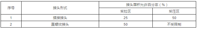 3、直螺纹钢筋接头任一接头中心至35d且≥500mm范围内及绑扎接头中心至搭接长度的1.3倍区段范围内,受力钢筋接头面积允许百分率为:
