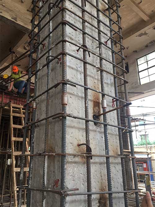 比如:某商场改造后需增设扶梯,采取在框架柱上增设牛腿。牛腿与原柱的连接采用化学植筋。