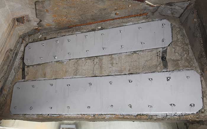 锚固在混凝土结构的受拉缘或薄弱部位,使其与结构形成整体,以钢板代替增设的补强钢筋。