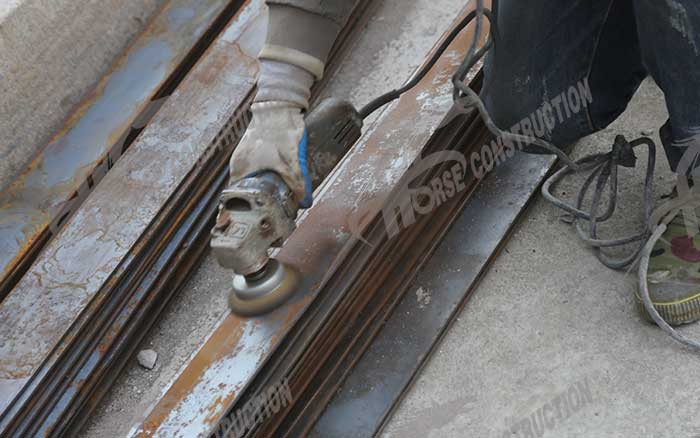 2.加固用钢板涂胶表面处理:钢板本身应为展平、无内应力的钢板,并经过除锈、清洗油污粉尘、杂质等表面清洁处理,然后用砂轮打毛(粗糙化)处理,打毛后的钢板应露出金属光泽,粗化的纹路应尽量垂直于受力方向;应对钢板进一步展平,使达到与混凝土表面平整服帖,并且与被粘部位的尺寸与划线相吻合。钢板应是剪板机按尺寸裁剪的,若用其他加工方式或在边缘出现卷边或毛刺,应该清除,达到平整以避免对粘结界面造成不利影响。