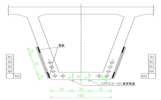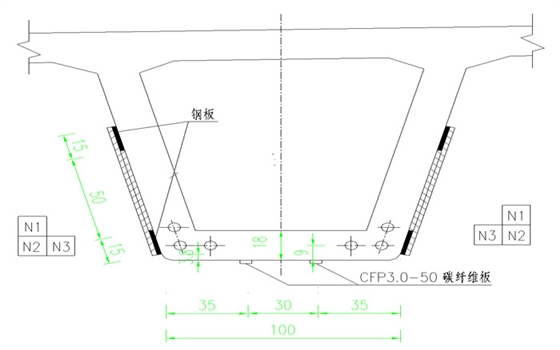 1.本桥出现的组合箱梁腹板竖缝及底板横缝缝宽均<0.15mm,不对其进行封缝处理。本次设计一方面拟对底板粘贴预应力碳纤维板,增加梁体的压应力,延缓底板出现裂缝的时间;同时对腹板粘贴钢板、双向碳纤维网格,增强梁体的抗剪承载能力,限制腹板裂缝产生和发展,相关构造如下图所示: