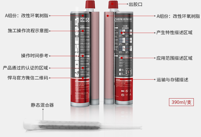 在双腔胶筒中分别装有反应树脂与固化剂,使用专用的注射式胶枪,把在胶筒中隔离放置的双组成份同时挤进静力混合器